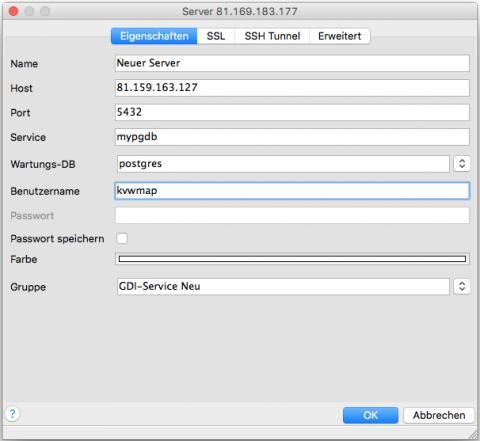 Die Konfiguration der Verbindung wird in einer Datei ~/.pg_service.conf abgelegt. Falls die nicht im Home-Verzeichnis des Nutzer existiert kann die dort angelegt werden.