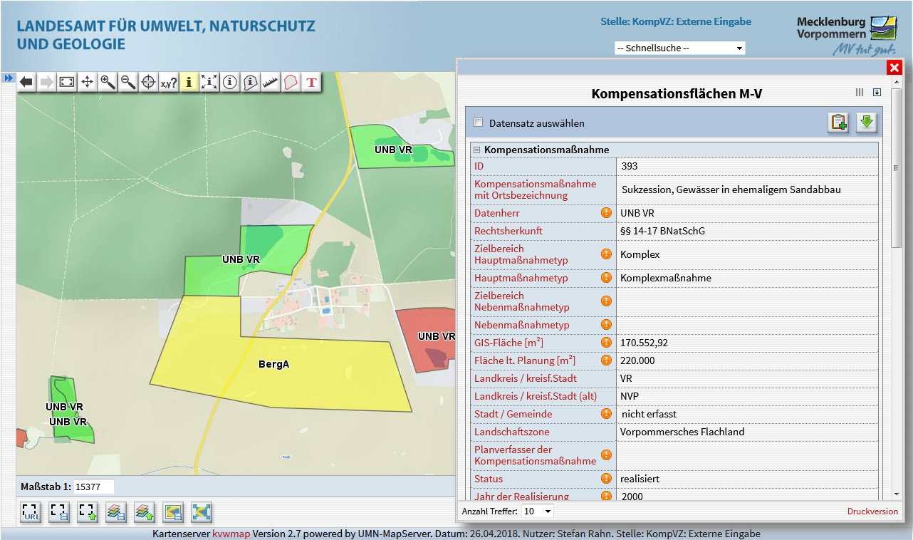 Für das Landesamt für Umwelt, Naturschutz und Geologie Mecklenburg-Vorpommern wurde auf Basis von kvwmap ein WebGIS aufgesetzt, mit dem u.a. das Kompensations- und Ökokontoverzeichnisses verwaltet wird. Das Verzeichnis dient im Rahmen der naturschutzrechtlichen Eingriffs-Ausgleichs-Regelung der Erfassung und Dokumentation von Kompensationsmaßnahmen und den zugehörigen Flächen sowie der Verwaltung von Ökokonten in Mecklenburg-Vorpommern.